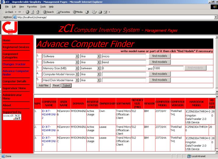 February 6, 2006: zCI version 2.2 is released. This version has new Advance Computer Finder, HTTP-POST style client data sending, renewed software inventory and supports implementation in login script. Advance Computer Finder enables IT staffs to search for computers using unlimited multiple filters, such as processor speed, installed application, harddisk size and etc.